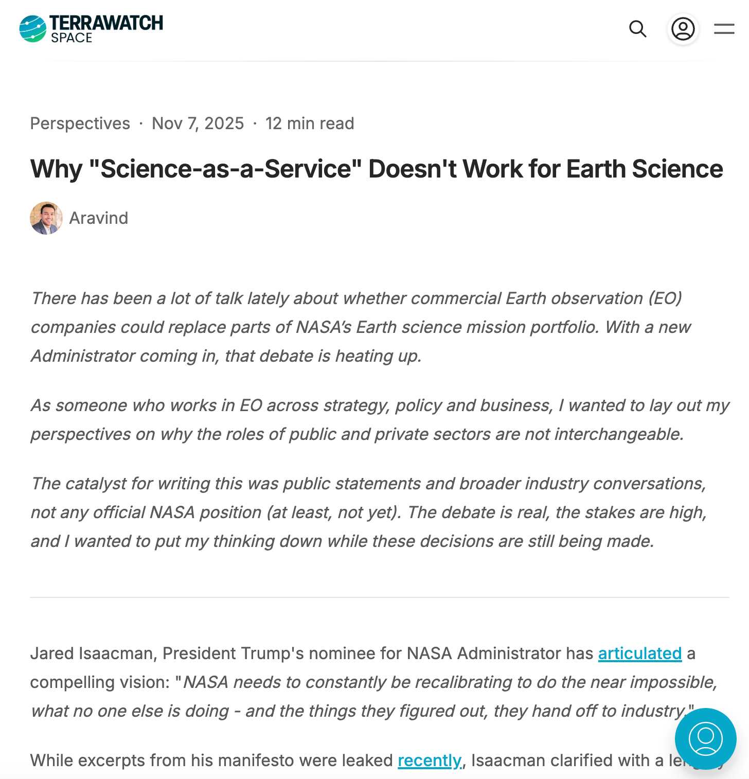 NASA and agencies like ESA don't operate Earth science missions because commercial providers can't build satellites. They operate them because some observations are too important to depend on business models, shareholder returns, or market conditions. … The real question is not whether NASA can save money by buying data from commercial EO providers. It is whether we are willing to risk the continuity, openness, and reliability of the observations that underpin our understanding of the Earth. The answer should be obvious.